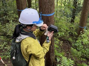 井上氏から立木を測定する時に使用する器具の説明を受け、調査を開始しました。
