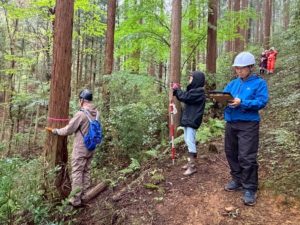 およそ500平米内にあるスギ全ての樹高・胸高直径を4班で手分けしながら測定しました。
